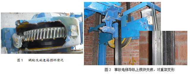 ,在重力的作用下对重装置又会下落,此时曳引绳会对正在转动的曳引轮反向施加了快速拖动的力,造成蜗轮与蜗杆的相互敲击,同时使得轿厢向上窜动。这时安全钳的楔块松开,由于曳引机未停下仍在转动,轿厢可能恢复下行的状态。若安全钳的楔块再次误动作,则对重装置仍会继续上行、下落的过程。如果电机不停止转动,则这过程将周而复始从复循环下去,由于曳引绳反向力的存在,使得曳引绳作用于曳引轮绳槽的正压力一次比一次大,嵌入绳槽也越来越紧,更造成曳引绳不易脱槽,此时的就是绳与绳槽的嵌变大,曳引力也就一直增大,结果对重装置被提起的高度一次比一次高,蜗轮与蜗杆之间的撞击力一次比一次强,到蜗杆窜动移位撞烂电动机或蜗轮断齿、爆裂,更严重的或造成减速箱体撑烂(图1),直至最后曳引机传动完全失效为止。