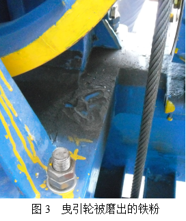 ,曳引绳在曳引轮上有打滑的情况(图3),时间长了钢丝绳局部就会过热,甚至磨损断丝,造成绳径、轮槽以及材料的摩擦面的改变,一定情度下当量摩擦系数